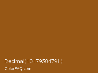 Decimal 13179584791 Color is a normal orange color and the nearest color is Hawaiian Tan #9d5616. Hex code #975715 and RGB value is rgb(151,87,21). In RGB color space, this color is composed of 59% red, 34% green, 8% blue, In CMYK color space, this color is composed of 0% cyan, 42% magenta, 86% yellow , 41% black , In HSL color space, this color has a hue angle of 30° , 76% saturation and 34% lightness.