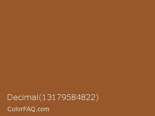 Decimal 13179584822 Color is a normal orange color and the nearest color is Paarl #a65529. Hex code #975728 and RGB value is rgb(151,87,40). In RGB color space, this color is composed of 59% red, 34% green, 16% blue, In CMYK color space, this color is composed of 0% cyan, 42% magenta, 74% yellow , 41% black , In HSL color space, this color has a hue angle of 25° , 58% saturation and 37% lightness.