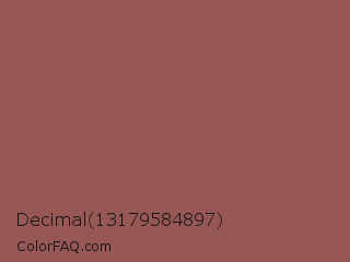 Decimal 13179584897 Color is a normal red color and the nearest color is Au Chico #97605d. Hex code #975755 and RGB value is rgb(151,87,85). In RGB color space, this color is composed of 59% red, 34% green, 33% blue, In CMYK color space, this color is composed of 0% cyan, 42% magenta, 44% yellow , 41% black , In HSL color space, this color has a hue angle of 2° , 28% saturation and 46% lightness.