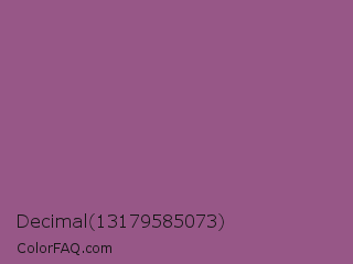 Decimal 13179585073 Color is a normal magenta color and the nearest color is Antique Fuchsia #915c83. Hex code #975787 and RGB value is rgb(151,87,135). In RGB color space, this color is composed of 59% red, 34% green, 53% blue, In CMYK color space, this color is composed of 0% cyan, 42% magenta, 11% yellow , 41% black , In HSL color space, this color has a hue angle of 315° , 27% saturation and 47% lightness.