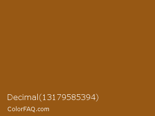 Decimal 13179585394 Color is a normal orange color and the nearest color is Hawaiian Tan #9d5616. Hex code #975814 and RGB value is rgb(151,88,20). In RGB color space, this color is composed of 59% red, 35% green, 8% blue, In CMYK color space, this color is composed of 0% cyan, 42% magenta, 87% yellow , 41% black , In HSL color space, this color has a hue angle of 31° , 77% saturation and 34% lightness.