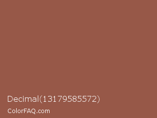Decimal 13179585572 Color is a normal red color and the nearest color is Coconut #965a3e. Hex code #975848 and RGB value is rgb(151,88,72). In RGB color space, this color is composed of 59% red, 35% green, 28% blue, In CMYK color space, this color is composed of 0% cyan, 42% magenta, 52% yellow , 41% black , In HSL color space, this color has a hue angle of 12° , 35% saturation and 44% lightness.
