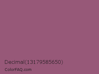 Decimal 13179585650 Color is a normal rose color and the nearest color is Sugar Plum #914e75. Hex code #975878 and RGB value is rgb(151,88,120). In RGB color space, this color is composed of 59% red, 35% green, 47% blue, In CMYK color space, this color is composed of 0% cyan, 42% magenta, 21% yellow , 41% black , In HSL color space, this color has a hue angle of 330° , 26% saturation and 47% lightness.