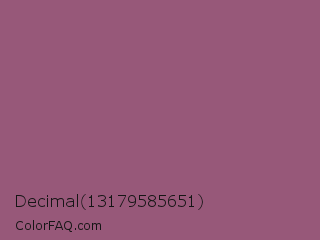 Decimal 13179585651 Color is a normal rose color and the nearest color is Antique Fuchsia #915c83. Hex code #975879 and RGB value is rgb(151,88,121). In RGB color space, this color is composed of 59% red, 35% green, 47% blue, In CMYK color space, this color is composed of 0% cyan, 42% magenta, 20% yellow , 41% black , In HSL color space, this color has a hue angle of 329° , 26% saturation and 47% lightness.