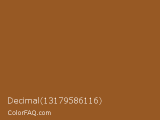 Decimal 13179586116 Color is a normal orange color and the nearest color is Hawaiian Tan #9d5616. Hex code #975924 and RGB value is rgb(151,89,36). In RGB color space, this color is composed of 59% red, 35% green, 14% blue, In CMYK color space, this color is composed of 0% cyan, 41% magenta, 76% yellow , 41% black , In HSL color space, this color has a hue angle of 28° , 61% saturation and 37% lightness.