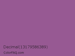 Decimal 13179586389 Color is a normal magenta color and the nearest color is Trendy Pink #8c6495. Hex code #975993 and RGB value is rgb(151,89,147). In RGB color space, this color is composed of 59% red, 35% green, 58% blue, In CMYK color space, this color is composed of 0% cyan, 41% magenta, 3% yellow , 41% black , In HSL color space, this color has a hue angle of 304° , 26% saturation and 47% lightness.