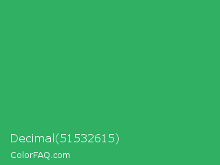 Decimal 51532615 Color is a normal green color and the nearest color is Chateau Green #40a860. Hex code #2fb063 and RGB value is rgb(47,176,99). In RGB color space, this color is composed of 18% red, 69% green, 39% blue, In CMYK color space, this color is composed of 73% cyan, 0% magenta, 44% yellow , 31% black , In HSL color space, this color has a hue angle of 144° , 58% saturation and 44% lightness.