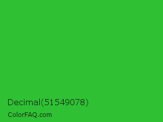 Decimal 51549078 Color is a normal green color and the nearest color is Lime Green #32cd32. Hex code #2fc034 and RGB value is rgb(47,192,52). In RGB color space, this color is composed of 18% red, 75% green, 20% blue, In CMYK color space, this color is composed of 76% cyan, 0% magenta, 73% yellow , 25% black , In HSL color space, this color has a hue angle of 122° , 61% saturation and 47% lightness.