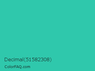 Decimal 51582308 Color is a normal cyan color and the nearest color is Puerto Rico #3fc1aa. Hex code #2fc8ac and RGB value is rgb(47,200,172). In RGB color space, this color is composed of 18% red, 78% green, 67% blue, In CMYK color space, this color is composed of 77% cyan, 0% magenta, 14% yellow , 22% black , In HSL color space, this color has a hue angle of 169° , 62% saturation and 48% lightness.