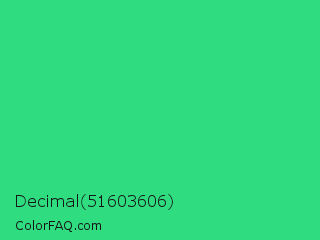 Decimal 51603606 Color is a normal green color and the nearest color is UFO Green #3cd070. Hex code #2fdd80 and RGB value is rgb(47,221,128). In RGB color space, this color is composed of 18% red, 87% green, 50% blue, In CMYK color space, this color is composed of 79% cyan, 0% magenta, 42% yellow , 13% black , In HSL color space, this color has a hue angle of 148° , 72% saturation and 53% lightness.