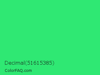 Decimal 51615385 Color is a normal green color and the nearest color is UFO Green #3cd070. Hex code #2fe873 and RGB value is rgb(47,232,115). In RGB color space, this color is composed of 18% red, 91% green, 45% blue, In CMYK color space, this color is composed of 80% cyan, 0% magenta, 50% yellow , 9% black , In HSL color space, this color has a hue angle of 142° , 80% saturation and 55% lightness.