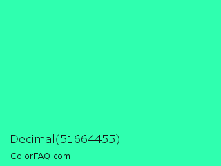 Decimal 51664455 Color is a normal green color and the nearest color is Eucalyptus #44d7a8. Hex code #2fffaf and RGB value is rgb(47,255,175). In RGB color space, this color is composed of 18% red, 100% green, 69% blue, In CMYK color space, this color is composed of 82% cyan, 0% magenta, 31% yellow , 0% black , In HSL color space, this color has a hue angle of 157° , 100% saturation and 59% lightness.
