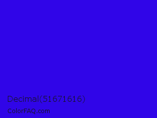 Decimal 51671616 Color is a normal indigo color and the nearest color is Electric Ultramarine #3f00ff. Hex code #3005e8 and RGB value is rgb(48,5,232). In RGB color space, this color is composed of 19% red, 2% green, 91% blue, In CMYK color space, this color is composed of 79% cyan, 98% magenta, 0% yellow , 9% black , In HSL color space, this color has a hue angle of 251° , 96% saturation and 46% lightness.