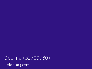 Decimal 51709730 Color is a dark indigo color and the nearest color is Persian Indigo #32127a. Hex code #301382 and RGB value is rgb(48,19,130). In RGB color space, this color is composed of 19% red, 7% green, 51% blue, In CMYK color space, this color is composed of 63% cyan, 85% magenta, 0% yellow , 49% black , In HSL color space, this color has a hue angle of 256° , 74% saturation and 29% lightness.