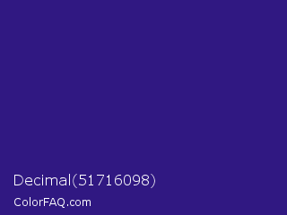 Decimal 51716098 Color is a dark indigo color and the nearest color is Persian Indigo #32127a. Hex code #301882 and RGB value is rgb(48,24,130). In RGB color space, this color is composed of 19% red, 9% green, 51% blue, In CMYK color space, this color is composed of 63% cyan, 82% magenta, 0% yellow , 49% black , In HSL color space, this color has a hue angle of 254° , 69% saturation and 30% lightness.