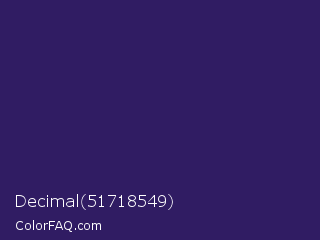 Decimal 51718549 Color is a dark indigo color and the nearest color is Violent Violet #290c5e. Hex code #301c63 and RGB value is rgb(48,28,99). In RGB color space, this color is composed of 19% red, 11% green, 39% blue, In CMYK color space, this color is composed of 52% cyan, 72% magenta, 0% yellow , 61% black , In HSL color space, this color has a hue angle of 257° , 56% saturation and 25% lightness.