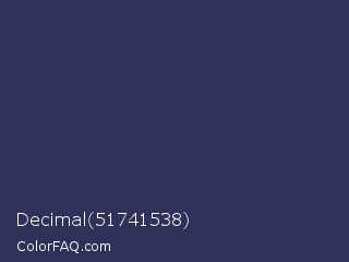 Decimal 51741538 Color is a dark blue color and the nearest color is Martinique #363050. Hex code #30315a and RGB value is rgb(48,49,90). In RGB color space, this color is composed of 19% red, 19% green, 35% blue, In CMYK color space, this color is composed of 47% cyan, 46% magenta, 0% yellow , 65% black , In HSL color space, this color has a hue angle of 239° , 30% saturation and 27% lightness.