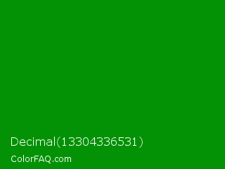Decimal 13304336531 Color is a dark green color and the nearest color is Islamic Green #009000. Hex code #039205 and RGB value is rgb(3,146,5). In RGB color space, this color is composed of 1% red, 57% green, 2% blue, In CMYK color space, this color is composed of 98% cyan, 0% magenta, 97% yellow , 43% black , In HSL color space, this color has a hue angle of 121° , 96% saturation and 29% lightness.
