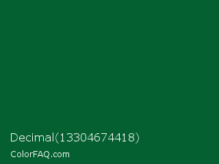 Decimal 13304674418 Color is a very dark green color and the nearest color is Fun Green #016d39. Hex code #046030 and RGB value is rgb(4,96,48). In RGB color space, this color is composed of 2% red, 38% green, 19% blue, In CMYK color space, this color is composed of 96% cyan, 0% magenta, 50% yellow , 62% black , In HSL color space, this color has a hue angle of 149° , 92% saturation and 20% lightness.