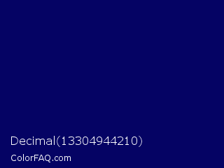 Decimal 13304944210 Color is a very dark indigo color and the nearest color is Arapawa #110c6c. Hex code #050364 and RGB value is rgb(5,3,100). In RGB color space, this color is composed of 2% red, 1% green, 39% blue, In CMYK color space, this color is composed of 95% cyan, 97% magenta, 0% yellow , 61% black , In HSL color space, this color has a hue angle of 241° , 94% saturation and 20% lightness.