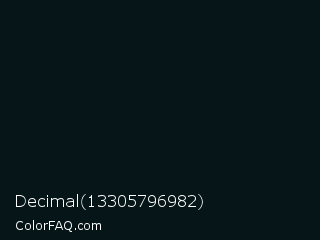 Decimal 13305796982 Color is a almost black cyan color and the nearest color is Bunker #0d1117. Hex code #061618 and RGB value is rgb(6,22,24). In RGB color space, this color is composed of 2% red, 9% green, 9% blue, In CMYK color space, this color is composed of 75% cyan, 8% magenta, 0% yellow , 91% black , In HSL color space, this color has a hue angle of 187° , 60% saturation and 6% lightness.