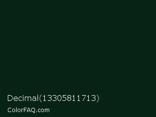 Decimal 13305811713 Color is a almost black green color and the nearest color is Palm Green #09230f. Hex code #062315 and RGB value is rgb(6,35,21). In RGB color space, this color is composed of 2% red, 14% green, 8% blue, In CMYK color space, this color is composed of 83% cyan, 0% magenta, 40% yellow , 86% black , In HSL color space, this color has a hue angle of 151° , 71% saturation and 8% lightness.