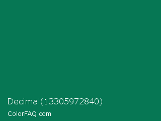 Decimal 13305972840 Color is a dark green color and the nearest color is Watercourse #056f57. Hex code #067754 and RGB value is rgb(6,119,84). In RGB color space, this color is composed of 2% red, 47% green, 33% blue, In CMYK color space, this color is composed of 95% cyan, 0% magenta, 29% yellow , 53% black , In HSL color space, this color has a hue angle of 161° , 90% saturation and 25% lightness.