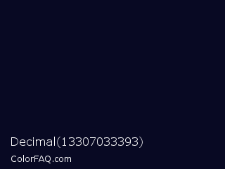 Decimal 13307033393 Color is a almost black blue color and the nearest color is Deep Ebony #0c0b1d. Hex code #080923 and RGB value is rgb(8,9,35). In RGB color space, this color is composed of 3% red, 4% green, 14% blue, In CMYK color space, this color is composed of 77% cyan, 74% magenta, 0% yellow , 86% black , In HSL color space, this color has a hue angle of 238° , 63% saturation and 8% lightness.