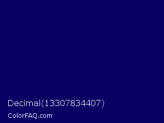 Decimal 13307834407 Color is a very dark indigo color and the nearest color is Arapawa #110c6c. Hex code #090063 and RGB value is rgb(9,0,99). In RGB color space, this color is composed of 4% red, 0% green, 39% blue, In CMYK color space, this color is composed of 91% cyan, 100% magenta, 0% yellow , 61% black , In HSL color space, this color has a hue angle of 245° , 100% saturation and 19% lightness.