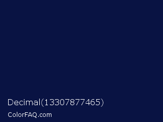 Decimal 13307877465 Color is a very dark blue color and the nearest color is Deep Cove #051040. Hex code #091343 and RGB value is rgb(9,19,67). In RGB color space, this color is composed of 4% red, 7% green, 26% blue, In CMYK color space, this color is composed of 87% cyan, 72% magenta, 0% yellow , 74% black , In HSL color space, this color has a hue angle of 230° , 76% saturation and 15% lightness.