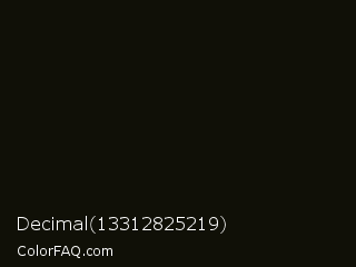 Decimal 13312825219 Color is a almost black yellow color and the nearest color is Smoky Black #100c08. Hex code #101007 and RGB value is rgb(16,16,7). In RGB color space, this color is composed of 6% red, 6% green, 3% blue, In CMYK color space, this color is composed of 0% cyan, 0% magenta, 56% yellow , 94% black , In HSL color space, this color has a hue angle of 60° , 39% saturation and 5% lightness.