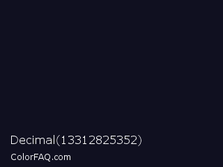Decimal 13312825352 Color is a almost black blue color and the nearest color is Vulcan #10121d. Hex code #101020 and RGB value is rgb(16,16,32). In RGB color space, this color is composed of 6% red, 6% green, 13% blue, In CMYK color space, this color is composed of 50% cyan, 50% magenta, 0% yellow , 87% black , In HSL color space, this color has a hue angle of 240° , 33% saturation and 9% lightness.