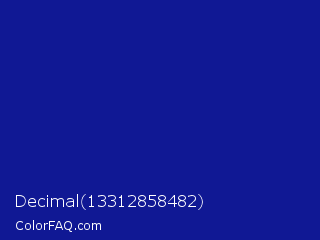 Decimal 13312858482 Color is a normal blue color and the nearest color is Indigo Dye #091f92. Hex code #101894 and RGB value is rgb(16,24,148). In RGB color space, this color is composed of 6% red, 9% green, 58% blue, In CMYK color space, this color is composed of 89% cyan, 84% magenta, 0% yellow , 42% black , In HSL color space, this color has a hue angle of 236° , 80% saturation and 32% lightness.