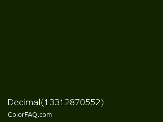 Decimal 13312870552 Color is a almost black green color and the nearest color is Pine Tree #171f04. Hex code #102402 and RGB value is rgb(16,36,2). In RGB color space, this color is composed of 6% red, 14% green, 1% blue, In CMYK color space, this color is composed of 56% cyan, 0% magenta, 94% yellow , 86% black , In HSL color space, this color has a hue angle of 95° , 89% saturation and 7% lightness.