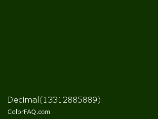 Decimal 13312885889 Color is a very dark green color and the nearest color is Deep Forest Green #182d09. Hex code #103201 and RGB value is rgb(16,50,1). In RGB color space, this color is composed of 6% red, 20% green, 0% blue, In CMYK color space, this color is composed of 68% cyan, 0% magenta, 98% yellow , 80% black , In HSL color space, this color has a hue angle of 102° , 96% saturation and 10% lightness.