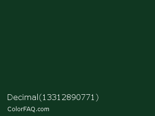 Decimal 13312890771 Color is a very dark green color and the nearest color is Phthalo Green #123524. Hex code #103721 and RGB value is rgb(16,55,33). In RGB color space, this color is composed of 6% red, 22% green, 13% blue, In CMYK color space, this color is composed of 71% cyan, 0% magenta, 40% yellow , 78% black , In HSL color space, this color has a hue angle of 146° , 55% saturation and 14% lightness.