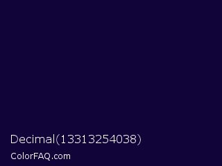Decimal 13313254038 Color is a very dark indigo color and the nearest color is Black Rock #0d0332. Hex code #110438 and RGB value is rgb(17,4,56). In RGB color space, this color is composed of 7% red, 2% green, 22% blue, In CMYK color space, this color is composed of 70% cyan, 93% magenta, 0% yellow , 78% black , In HSL color space, this color has a hue angle of 255° , 87% saturation and 12% lightness.