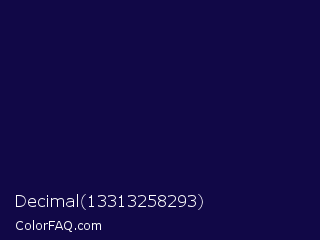 Decimal 13313258293 Color is a very dark indigo color and the nearest color is Tolopea #1b0245. Hex code #110847 and RGB value is rgb(17,8,71). In RGB color space, this color is composed of 7% red, 3% green, 28% blue, In CMYK color space, this color is composed of 76% cyan, 89% magenta, 0% yellow , 72% black , In HSL color space, this color has a hue angle of 249° , 80% saturation and 15% lightness.