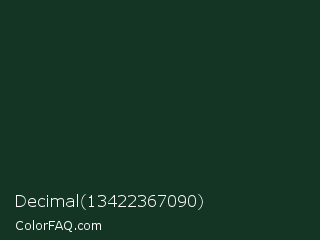 Decimal 13422367090 Color is a very dark green color and the nearest color is Phthalo Green #123524. Hex code #143424 and RGB value is rgb(20,52,36). In RGB color space, this color is composed of 8% red, 20% green, 14% blue, In CMYK color space, this color is composed of 62% cyan, 0% magenta, 31% yellow , 80% black , In HSL color space, this color has a hue angle of 150° , 44% saturation and 14% lightness.