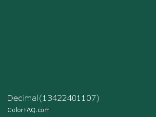 Decimal 13422401107 Color is a very dark cyan color and the nearest color is Brunswick Green #1b4d3e. Hex code #145545 and RGB value is rgb(20,85,69). In RGB color space, this color is composed of 8% red, 33% green, 27% blue, In CMYK color space, this color is composed of 76% cyan, 0% magenta, 19% yellow , 67% black , In HSL color space, this color has a hue angle of 165° , 62% saturation and 21% lightness.