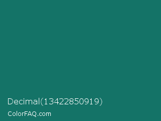 Decimal 13422850919 Color is a dark cyan color and the nearest color is Genoa #15736b. Hex code #147367 and RGB value is rgb(20,115,103). In RGB color space, this color is composed of 8% red, 45% green, 40% blue, In CMYK color space, this color is composed of 83% cyan, 0% magenta, 10% yellow , 55% black , In HSL color space, this color has a hue angle of 172° , 70% saturation and 26% lightness.