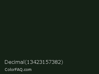 Decimal 13423157382 Color is a very dark green color and the nearest color is Hunter Green #161d10. Hex code #152216 and RGB value is rgb(21,34,22). In RGB color space, this color is composed of 8% red, 13% green, 9% blue, In CMYK color space, this color is composed of 38% cyan, 0% magenta, 35% yellow , 87% black , In HSL color space, this color has a hue angle of 125° , 24% saturation and 11% lightness.