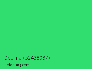 Decimal 52438037 Color is a normal green color and the nearest color is UFO Green #3cd070. Hex code #30dd6f and RGB value is rgb(48,221,111). In RGB color space, this color is composed of 19% red, 87% green, 44% blue, In CMYK color space, this color is composed of 78% cyan, 0% magenta, 50% yellow , 13% black , In HSL color space, this color has a hue angle of 142° , 72% saturation and 53% lightness.