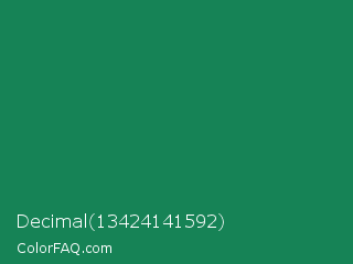 Decimal 13424141592 Color is a dark green color and the nearest color is Deep Green Cyan Turquoise #0e7c61. Hex code #168356 and RGB value is rgb(22,131,86). In RGB color space, this color is composed of 9% red, 51% green, 34% blue, In CMYK color space, this color is composed of 83% cyan, 0% magenta, 34% yellow , 49% black , In HSL color space, this color has a hue angle of 155° , 71% saturation and 30% lightness.
