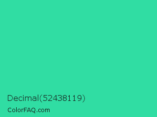 Decimal 52438119 Color is a normal green color and the nearest color is Shamrock #33cc99. Hex code #30dda3 and RGB value is rgb(48,221,163). In RGB color space, this color is composed of 19% red, 87% green, 64% blue, In CMYK color space, this color is composed of 78% cyan, 0% magenta, 26% yellow , 13% black , In HSL color space, this color has a hue angle of 160° , 72% saturation and 53% lightness.