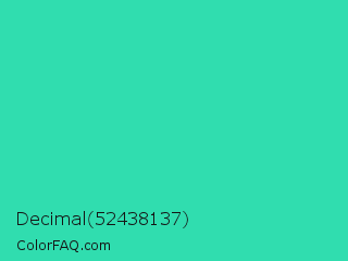 Decimal 52438137 Color is a normal cyan color and the nearest color is Eucalyptus #44d7a8. Hex code #30ddaf and RGB value is rgb(48,221,175). In RGB color space, this color is composed of 19% red, 87% green, 69% blue, In CMYK color space, this color is composed of 78% cyan, 0% magenta, 21% yellow , 13% black , In HSL color space, this color has a hue angle of 164° , 72% saturation and 53% lightness.