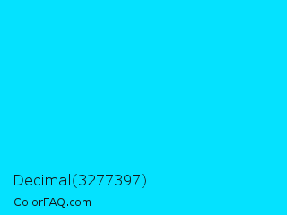 Decimal 3277397 Color is a normal cyan color and the nearest color is Vivid Sky Blue #00ccff. Hex code #04e2ff and RGB value is rgb(4,226,255). In RGB color space, this color is composed of 2% red, 89% green, 100% blue, In CMYK color space, this color is composed of 98% cyan, 11% magenta, 0% yellow , 0% black , In HSL color space, this color has a hue angle of 187° , 100% saturation and 51% lightness.