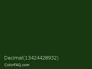 Decimal 13424428932 Color is a very dark green color and the nearest color is Palm Leaf #19330e. Hex code #173810 and RGB value is rgb(23,56,16). In RGB color space, this color is composed of 9% red, 22% green, 6% blue, In CMYK color space, this color is composed of 59% cyan, 0% magenta, 71% yellow , 78% black , In HSL color space, this color has a hue angle of 110° , 56% saturation and 14% lightness.