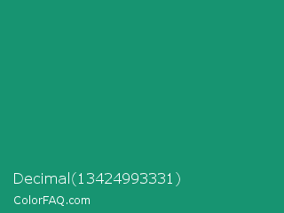Decimal 13424993331 Color is a normal green color and the nearest color is Elf Green #088370. Hex code #179471 and RGB value is rgb(23,148,113). In RGB color space, this color is composed of 9% red, 58% green, 44% blue, In CMYK color space, this color is composed of 84% cyan, 0% magenta, 24% yellow , 42% black , In HSL color space, this color has a hue angle of 163° , 73% saturation and 34% lightness.