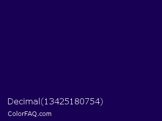 Decimal 13425180754 Color is a very dark indigo color and the nearest color is Tolopea #1b0245. Hex code #180054 and RGB value is rgb(24,0,84). In RGB color space, this color is composed of 9% red, 0% green, 33% blue, In CMYK color space, this color is composed of 71% cyan, 100% magenta, 0% yellow , 67% black , In HSL color space, this color has a hue angle of 257° , 100% saturation and 16% lightness.